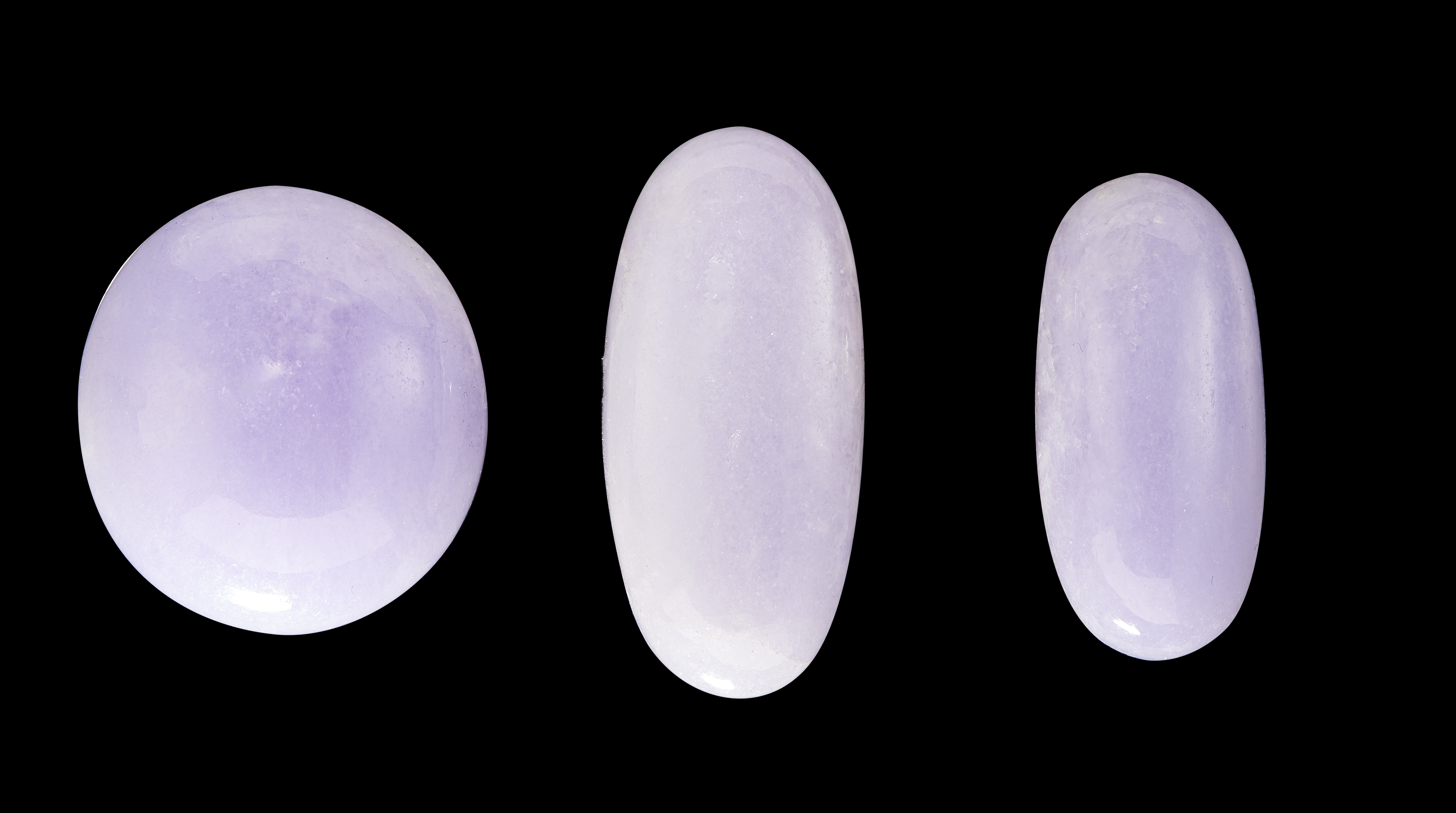 3 cabochons of jadeite jade, lavender color 24.8, 18.1 and 13.9 cts