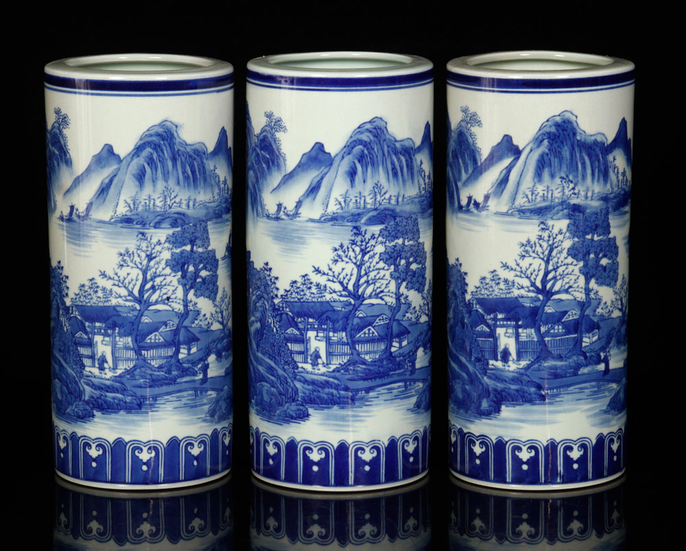 Lot of three signed Chinese blue and white vases, ceramic, decorated with mountain landscape