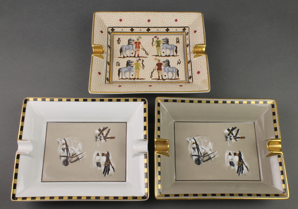 3 Hermes rectangular ashtrays with studies of horses and horses with attendants 7 1/2" x 6 1/2"