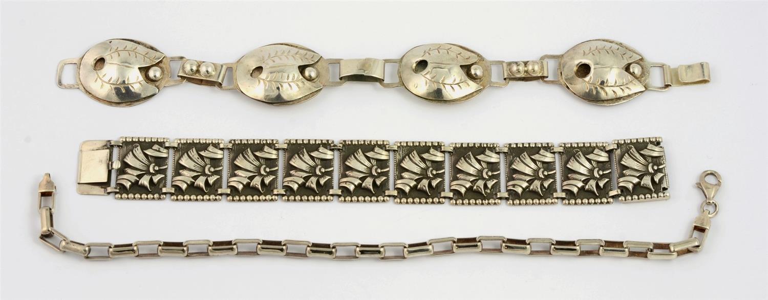 (3) Silver bracelets consisting of (1) panel bracelet, (1) large box link, longest measures 10, total weight 2.16 TO