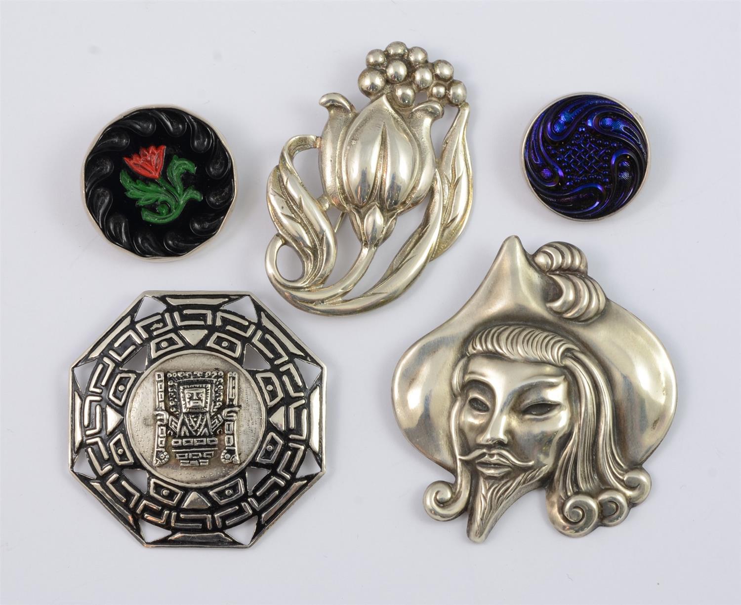 (5) Silver Pins, (2) Antique Button Brooches