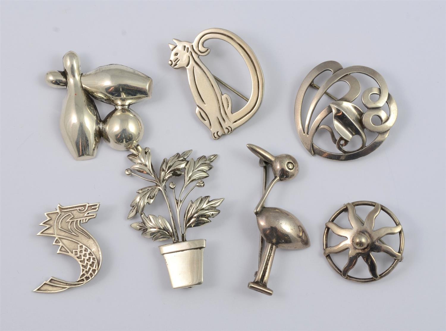 (7) Silver Pins, some hand made and some Mexican, largest measures 2 wide, total weight 1.45 TO