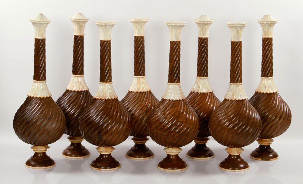 Set of eight Indian objets d'art, carved wood with bone, with turned reeded body