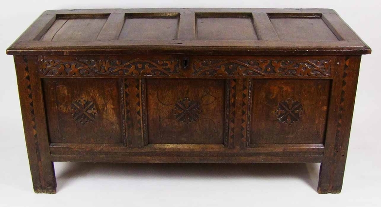 A 17th Century inlaid panelled oak coffer, the interior fitted with a candlebox, the carved front panels on stile feet