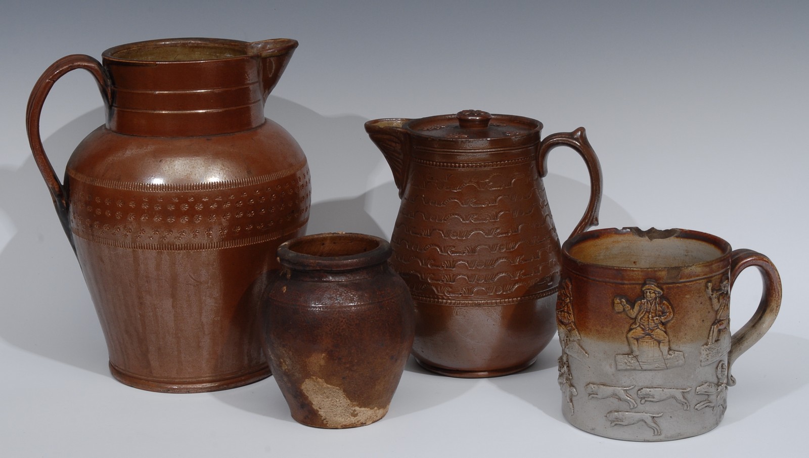 deep half girdle band, incised with stylised flowerheads, reeded loop handle, 27.5cm high, ... c.1860; a similar hot water jug and cover, 20.5cm high, c.1890; a similar porter mug, in relief with jolly topers, 26cm high, c.1860; etc (4)