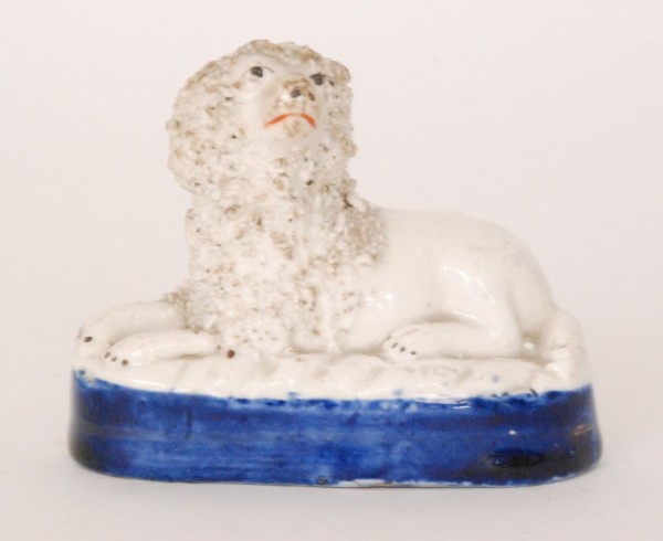 A 19th Century model of a seated spaniel with an encrusted upper body, sat upon a blue plinth, length 8cm, S/D