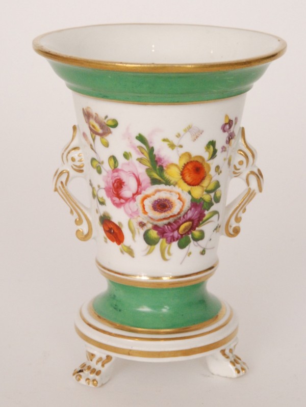 A 19th Century twin handled, footed spill vase decorated to one side with a hand painted floral spray and to the other with a single stem and foliage, the flared neck and foot rim with green and gold banding, the whole raised to three claw feet, unma