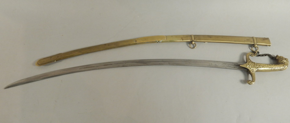 with a curved blade by Hamburger Rogers & Co of London, with tigers head pommel and brass chain, scabbard and blade AF