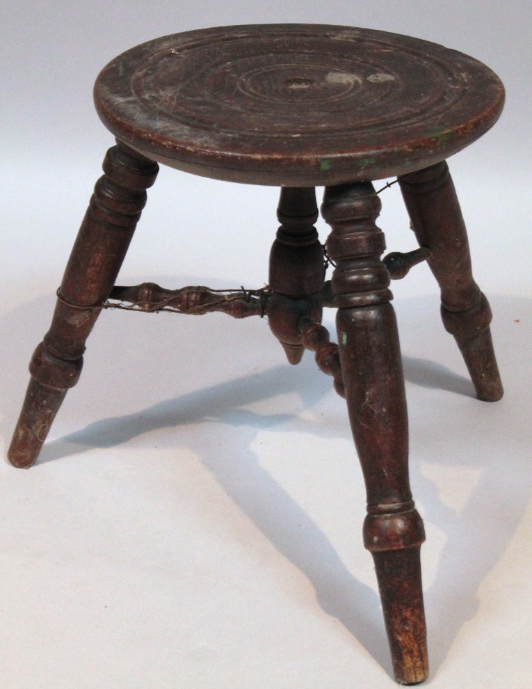 the circular top with a moulded rounded decoration, raised on triple turned supports joined by turned stretchers