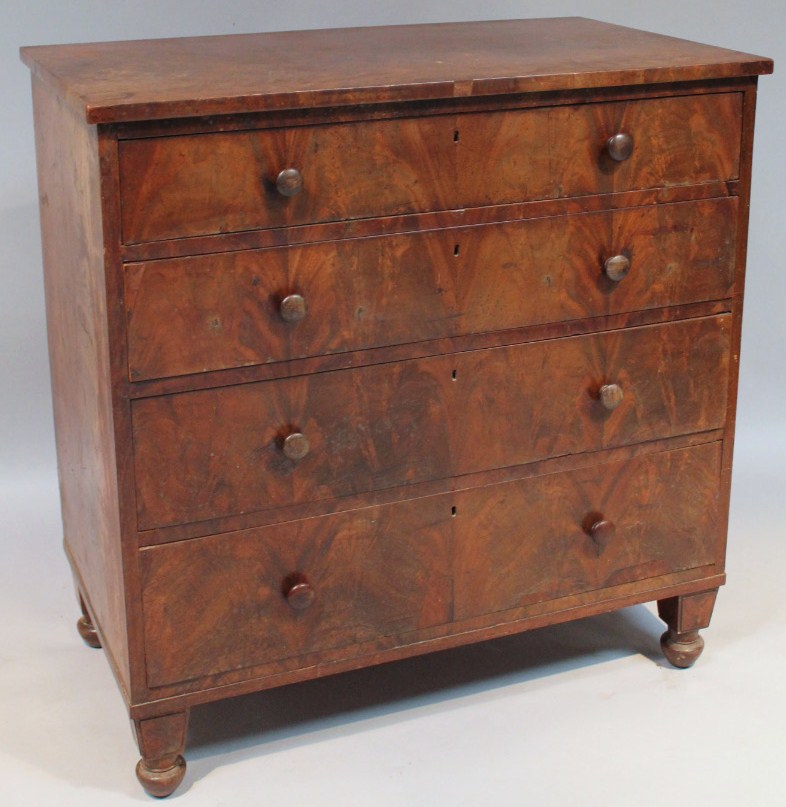 of four long drawers, with a plain moulded overhanging top, raised on compressed bun feet