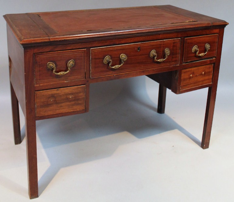after a Gillows design, the rectangular top with a hinged section set with a brown leather centre opening to reveal adjusting styles above five drawers on block supports