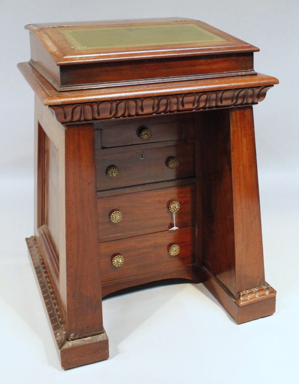 the removable top with hinged lid set with (later) stencilled green leather section hinging to reveal an open well above a classical designed base on tapering block supports centred by four well drawers and flanked a classical outline