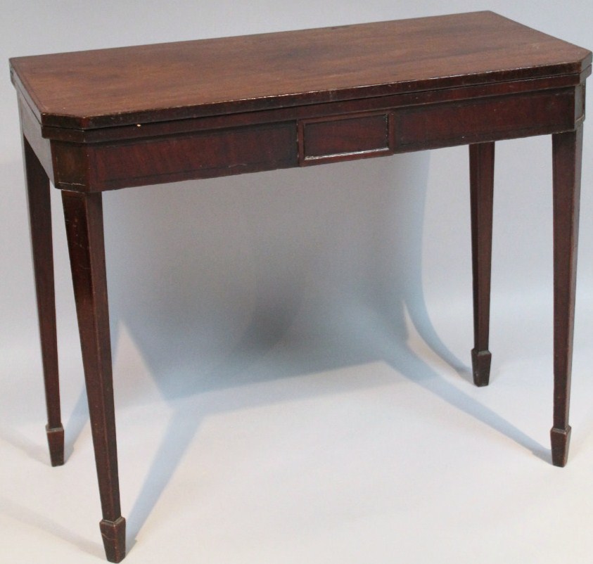 with canted corners, the top with (later) upholstered red baize, on square tapering supports terminating in spade feet