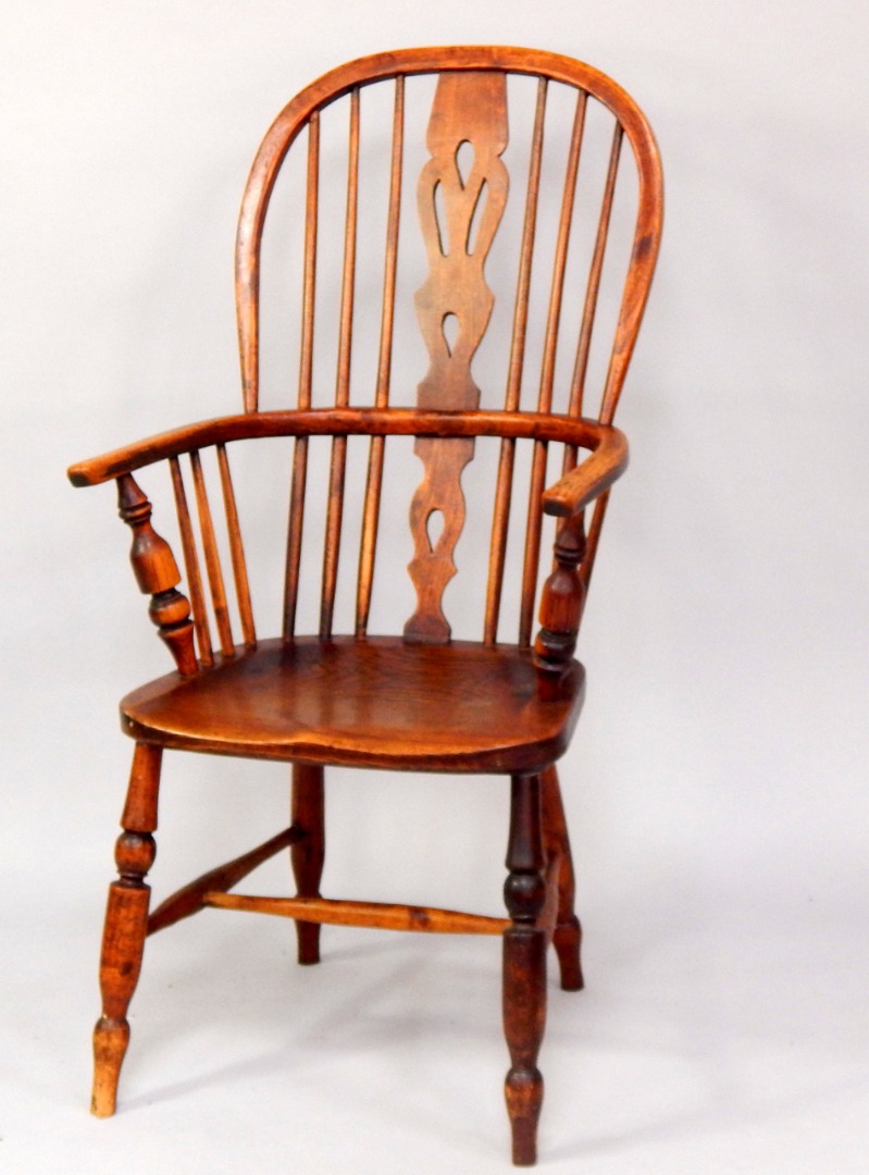 A 19thC oak and elm Windsor chair, raised on turned legs united by an H frame stretcher