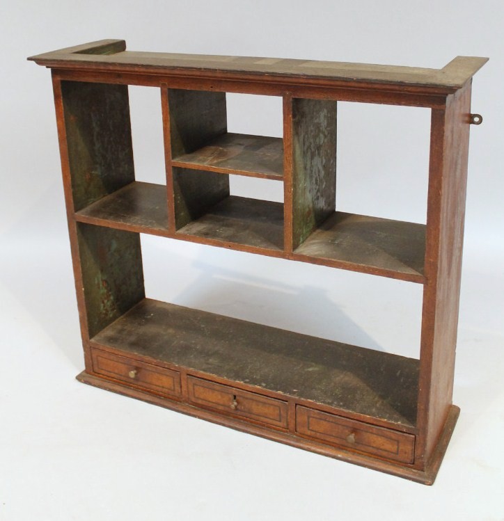 with a moulded D-end cornice raised above open pigeon holes and three spice drawers beneath, on a plain moulded base