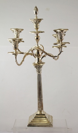 A 20TH CENTURY GEORGIAN STYLE FIVE LIGHT FOUR BRANCH EPNS CANDELABRUM, 20TH