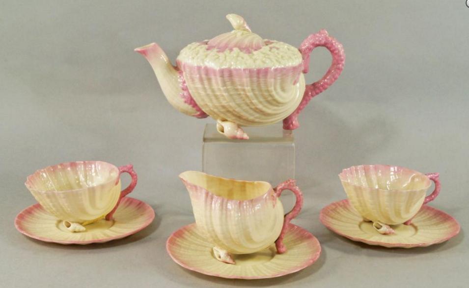 A Belleek porcelain pink shell part tea set