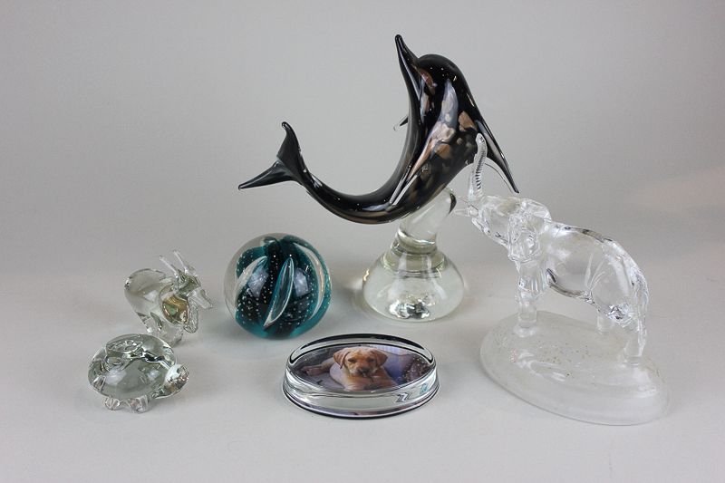 A Bermuda glass dolphin ornament, a clear glass elephant ornament and four paperweights