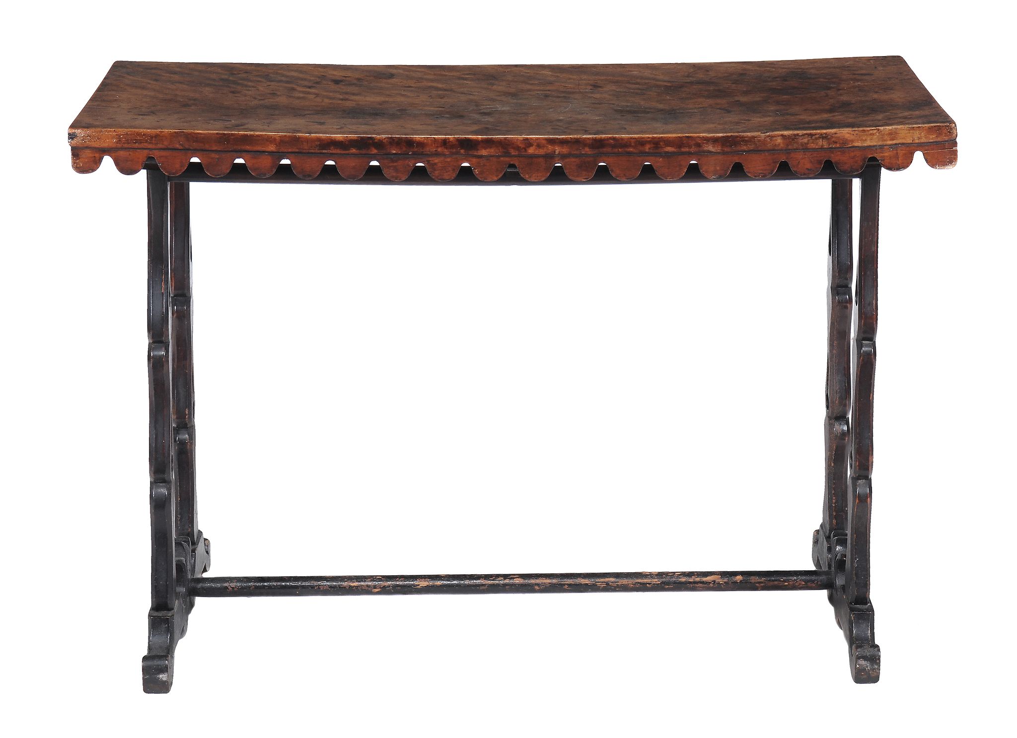 possibly American, the rectangular top above shaped apron and shaped pierced supports joined by stretchers and terminating in bipedal platform bases 77cm high, the top 112cm x 48cm