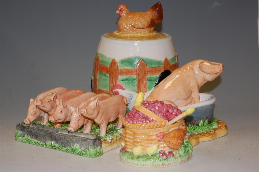 together with a Pig's toast-rack; Hen and chicks preserve pot; and a Hogwash moneybank (4)