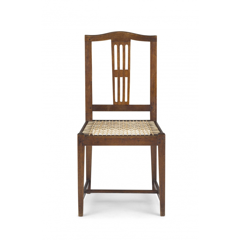 the yoke-shaped top rail above a pierced splat between square-section supports, riempie seat, on square-section tapering legs joined by an H-stretcher