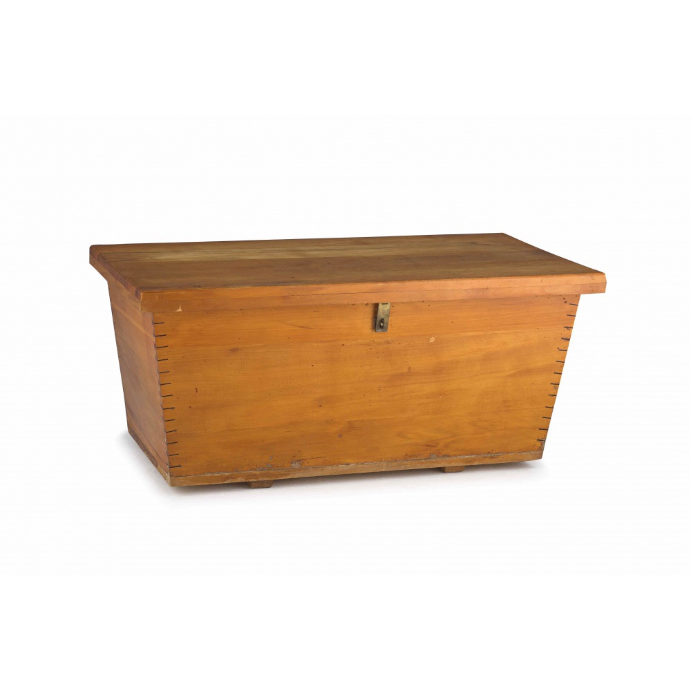 the rectangular hinged top above tapering sides, on a plinth base, raised on a pair of struts, 45cm high, 96,8cm wide, 50,2cm deep