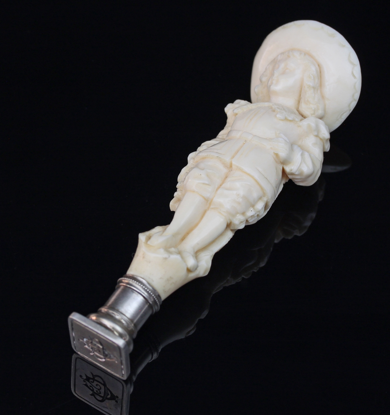 A carved ivory desk seal modelled as a boy in Victorian dress, the matrix with monogram