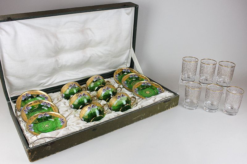 A cased set of six Bohemian green glass teacups and saucers decorated with hand painted violets and gilt embellishment (one cup