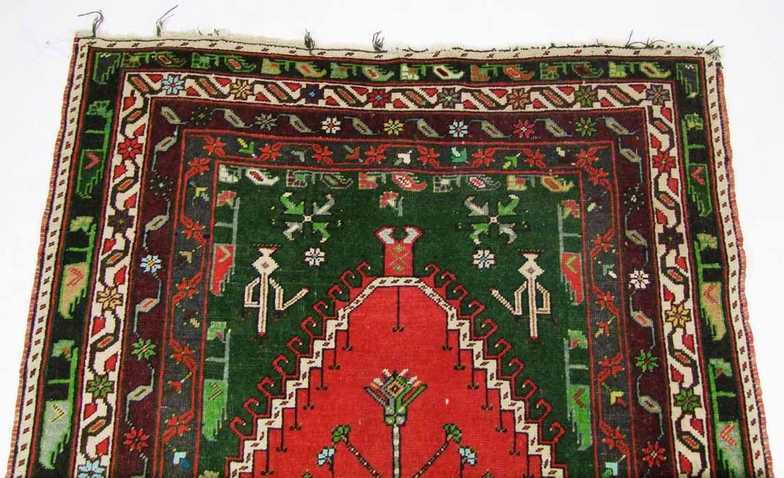 A Caucasian green ground prayer rug, the red mihrab with star motif