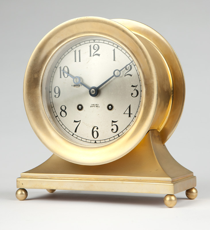 the cylindrical glazed case housing the silvered dial with black enameled Arabic numeral hour markers, raised on a spreading rectangular stepped plinth, on ball feet