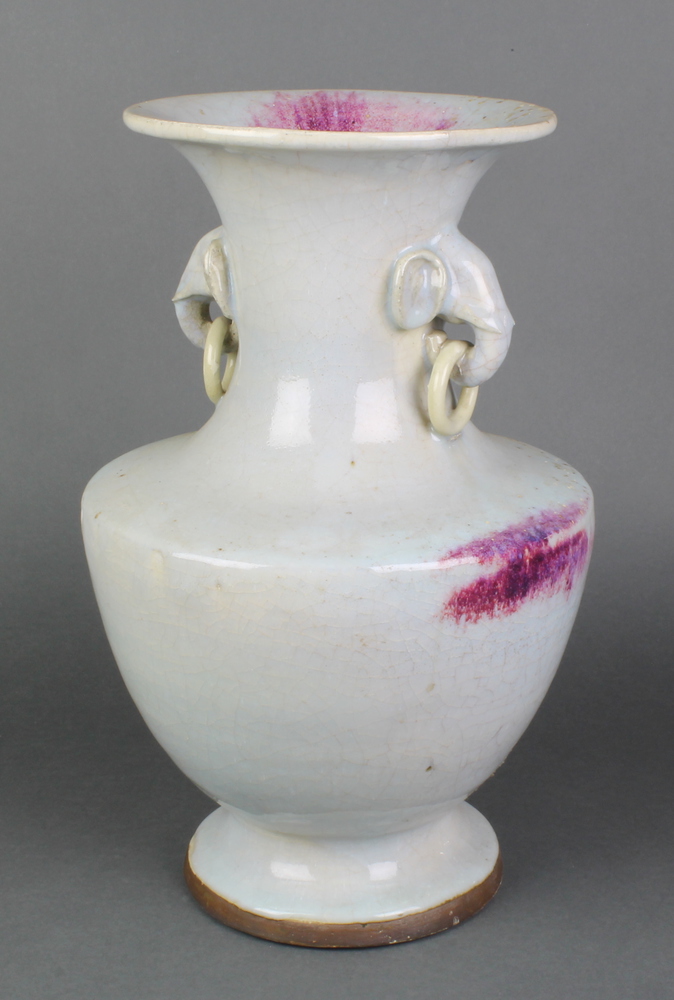 A Chinese pale blue crackle glaze baluster vase with flashes of sang de boeuf having elephant and ring handles 14 1/2"