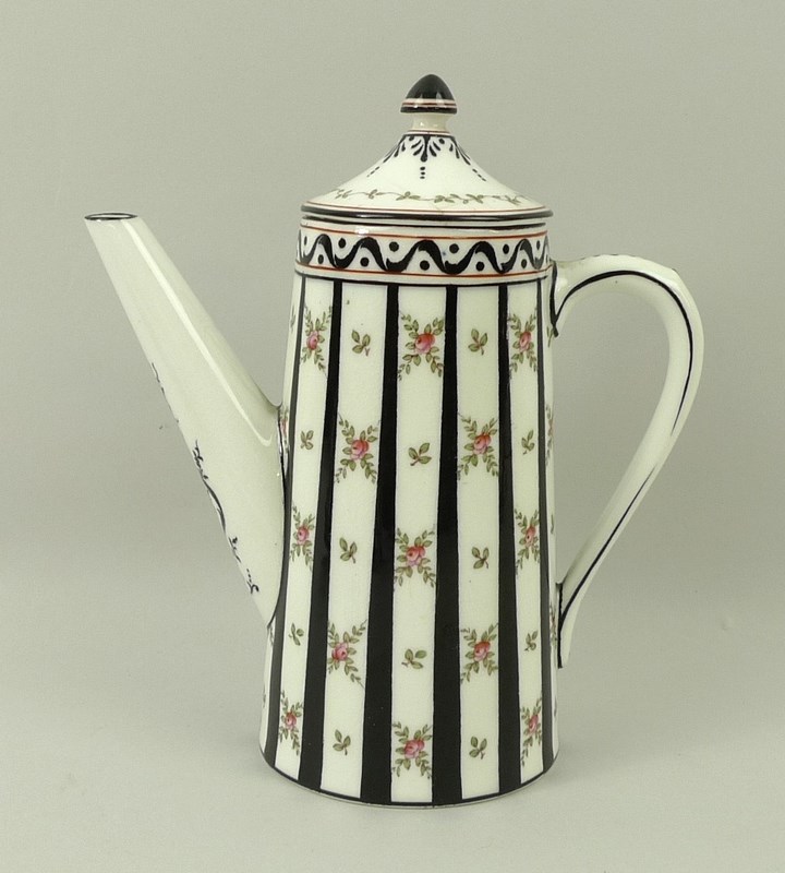 Rd 646573, in white ground with black stripes and floral detail, comprising coffee pot, cream jug, sugar bowl, and four coffee cans and three saucers. (10)