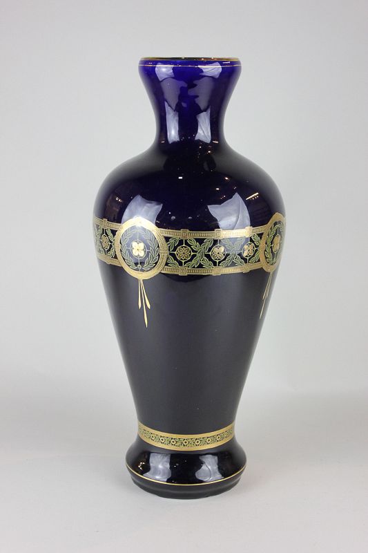 A cobalt blue glazed porcelain vase with gilt decoration of a stylized rose inside a laurel wreath, with banded border, paper label to base Alfred B Pearce & Co, London, impressed and painted marks to base, 41cm high