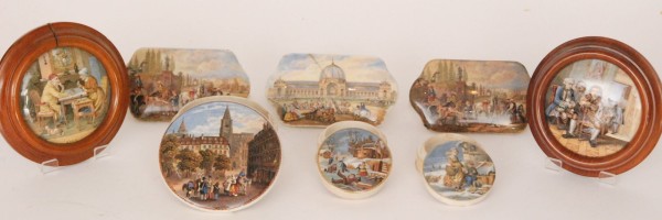 A collection of assorted 19th Century pot lids comprising two framed examples, A Pair and Dr Johnson, three trefoil box and covers, Alexandra Palace 1873 and two War (Wouvermann Binx), a large box and cover, The Square, Strasbourg and two smaller box