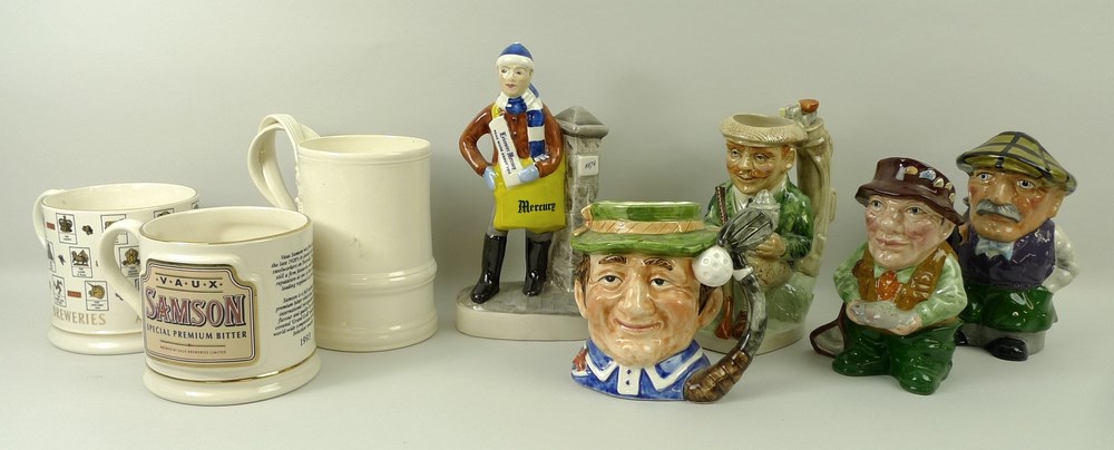 A collection of character jugs comprising Staffordshire 'Golfer', fisherman, Kevin Francis 'Little Golfer', a further character jug, Leedsware Classical Creamware tankard, two Wade mugs, and a Clayanger figure for 'Leicester Mercury'. (8)