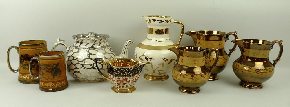 A collection of lustreware and ceramics, comprising an Arthur Wood silver lustre decorated teapot, a set of three graduated lustreware jugs, 12 to 16cm, two graduated tankards, 10 and 12cm, an Imari colourway jug with gilded interior, 9cm, and a furt
