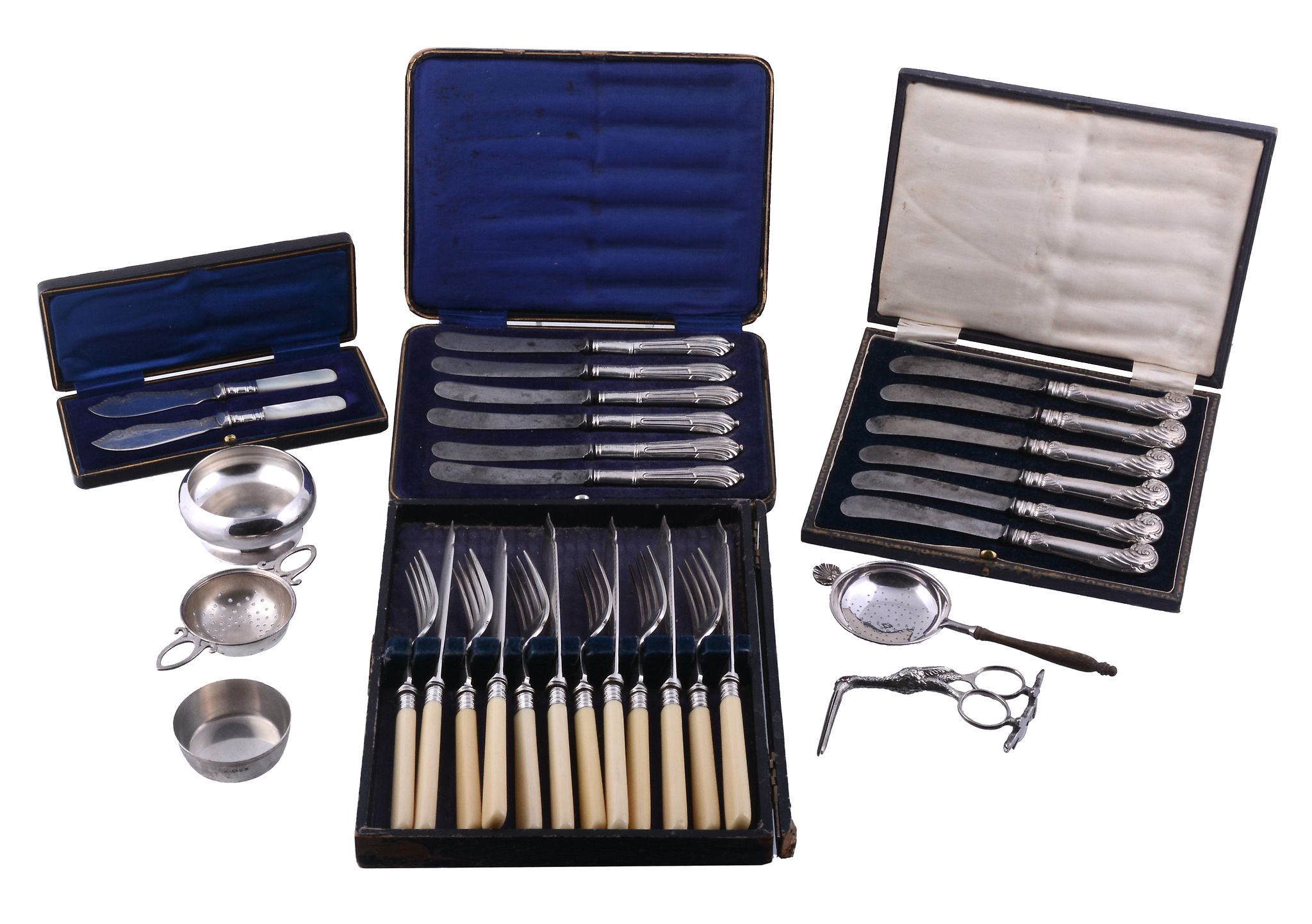 including: a late Victorian silver oval sauce boat by George Nathan & Ridley Hayes, Chester 1899; a tea strainer and stand by J. A. Campbell, London 1981; two sets of six silver handled tea knives, each cased; an electroplated stork ribbon puller; a