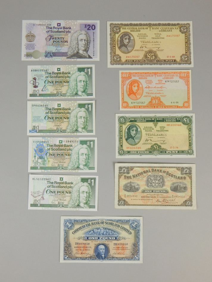 to include a Royal Bank of Scotland £20, a Central Bank of Ireland £5 note, etc.