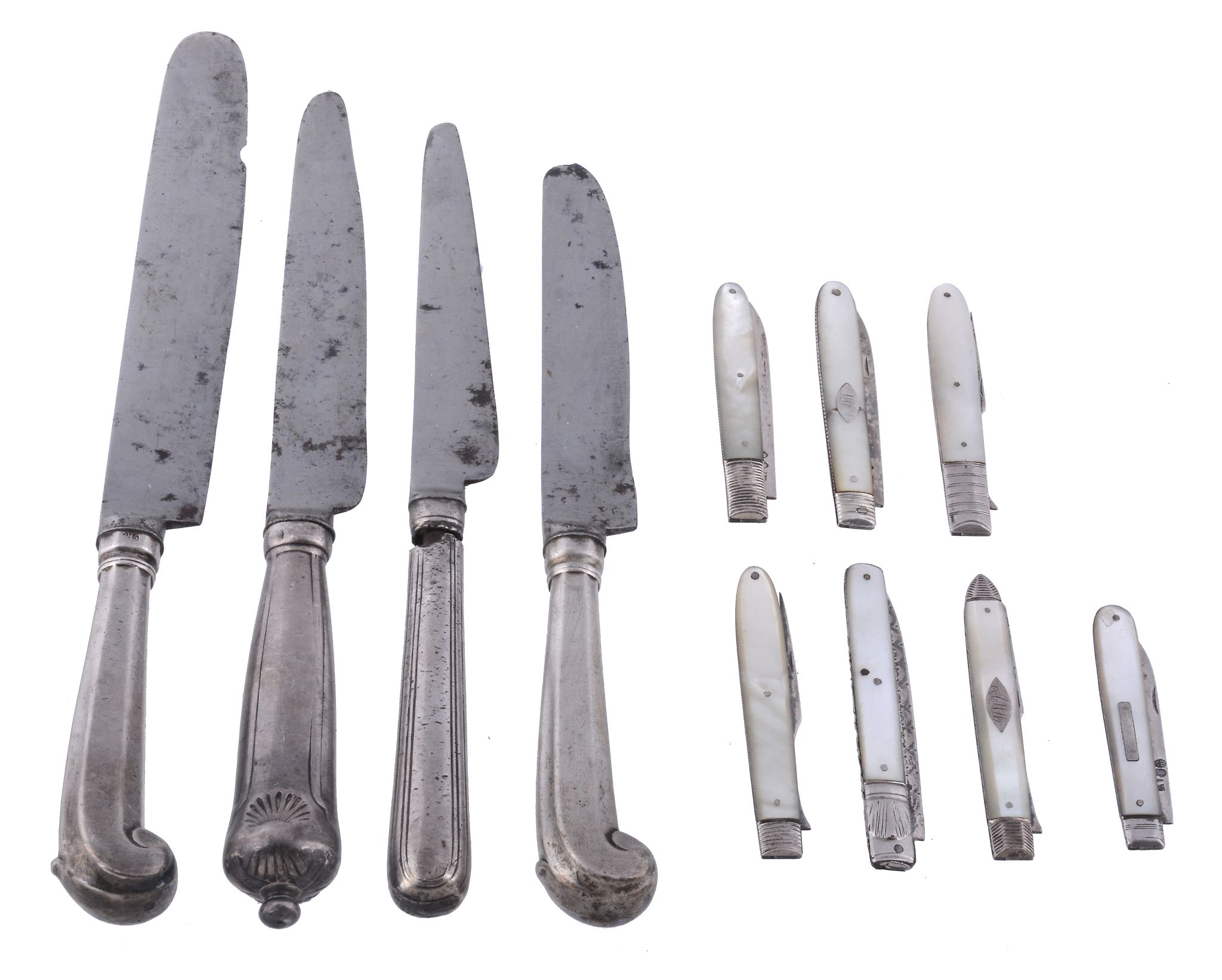 including: fourteen George III threaded dessert knives and forks, by Moses Brent, London 1813, and by George Cowles, no date; four George III or IV silver and mother of pearl folding fruit knives; three forks similar; three pickle forks; and other it