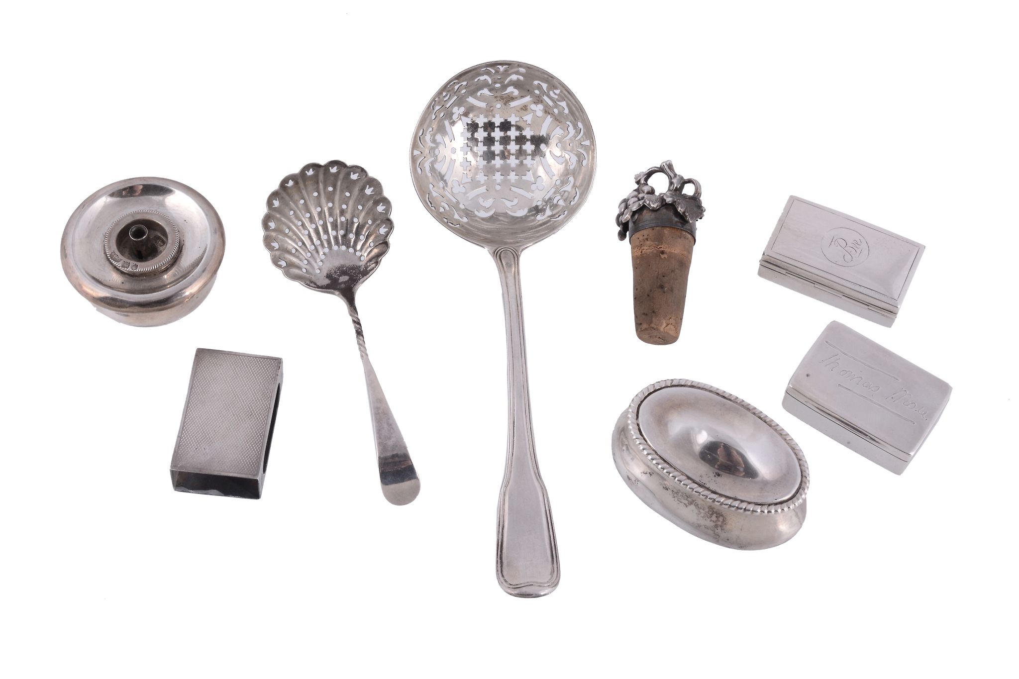 comprising: a George III silver French style fiddle pattern sugar sifting spoon by George Smith III, London up to 30th November 1784, with a mermaid in her vanity crest beneath an earl's coronet; a Victorian silver mounted cork stopper by Henry Wilki