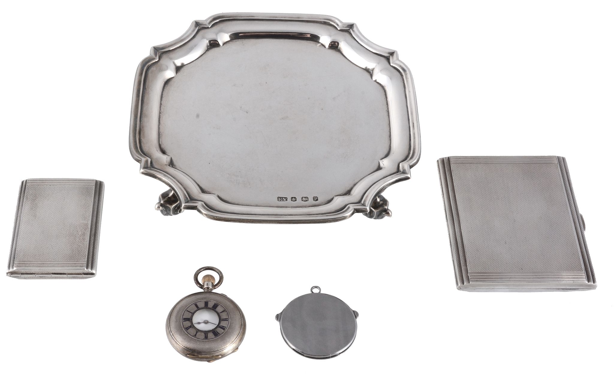 comprising: a cigarette case and matchbook holder, maker's mark D.BROS, Birmingham 1937 and 1934, engine turned the gilt interiors engraved P.V.S 16.10.37 ; anon, a Swiss silver cased open face keyless wind half hunter fob watch; a silver shaped squa