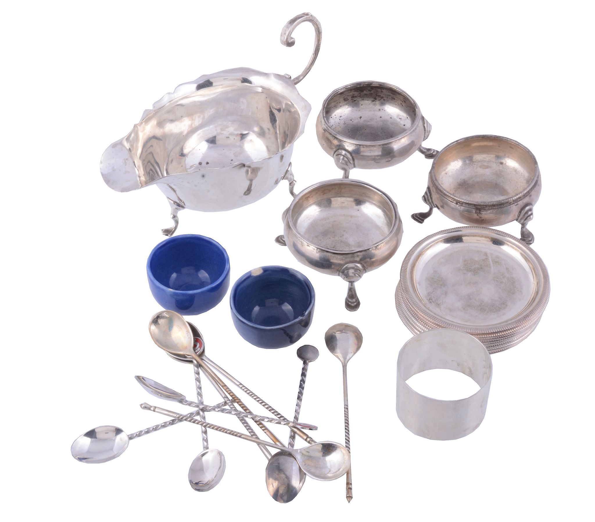 including: an oval sauceboat by Mappin & Webb, London 1918; a George III cauldron salt, London 1773; a pair of cauldron salts by Searle & Co. Ltd, London 1930; eight Italian silver coloured coasters or ashtrays, 1944-68 .800 standard; two napkin ring