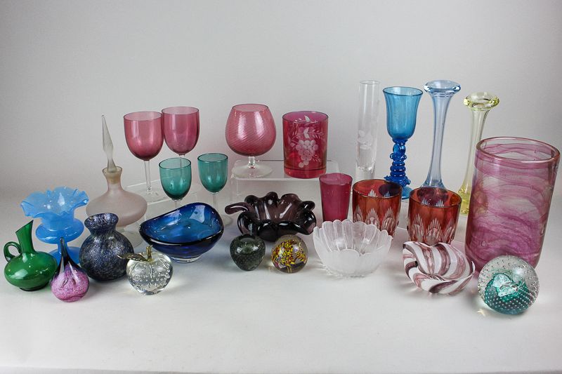 A collection of various coloured glass including two Caithness paperweights, a Swedish glass vase, a Kosta glass dish, a Roemer style blue wine glass and other items