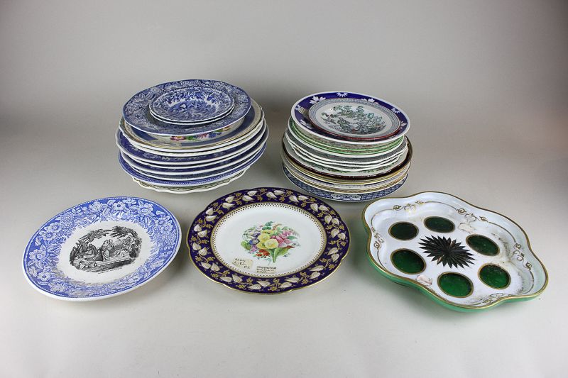 A collection of Victorian and later china plates including Staffordshire cabinet plates