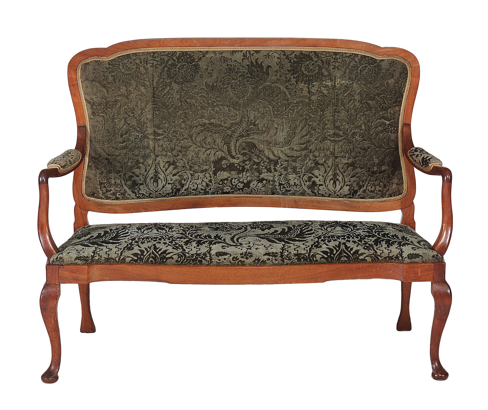 the shaped back upholstered in green velvet leading to open arms, drop in seat, and cabriole legs
