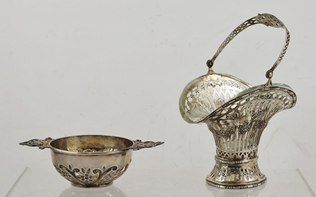 A CONTINENTAL WHITE METAL BONBON BASKET, pierced and cast with floral swags, swing handle and clear glass liner, stamped 800, without liner 150g, together with an Edwardian decorative TWO-HANDLED STRAINER, London 1902, weight 90g