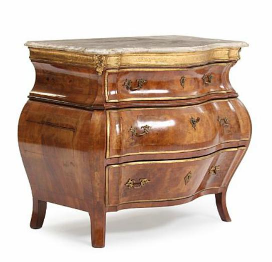 A Danish 18th century partly gilded Rococo walnut chest of drawers