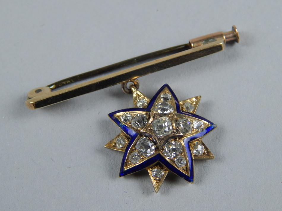 set with diamonds and picked out in blue enamel, 3.2cm wide overall, yellow metal