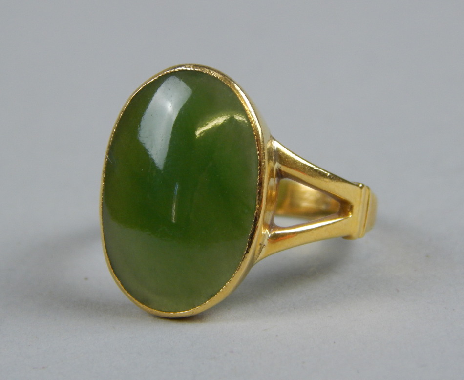 A dress ring, set with jade, yellow metal, marked 22c, 4.6g all in