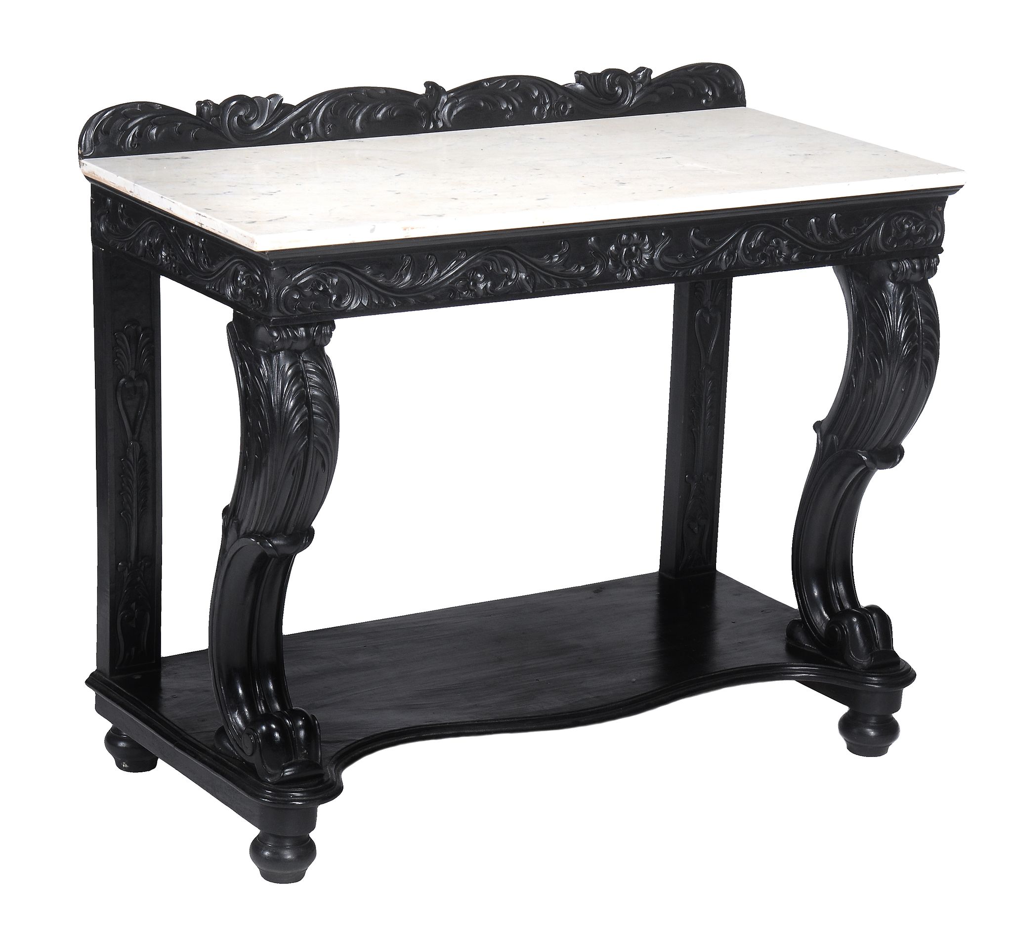 the white marble top over leaf carved apron and scroll front supports, with moulded concave undertier